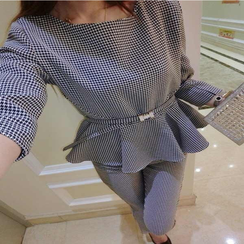 > Damen Bekleidung > Anzüge > Herbst Damen lässig Steht drei viertel Ärmel o Hals Houndstooth pattenr Pullover Hemd und 9 Stift Hose 9288