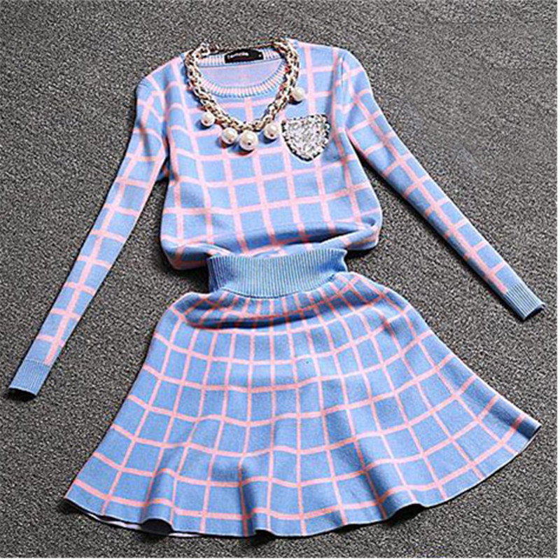 > Damen Bekleidung > Anzüge > neue Stricken lange Ärmel Pullover Rock Steht Damen süß Perlen Kragen gestrickt Häkeln Raster Pflanzliche Top linie