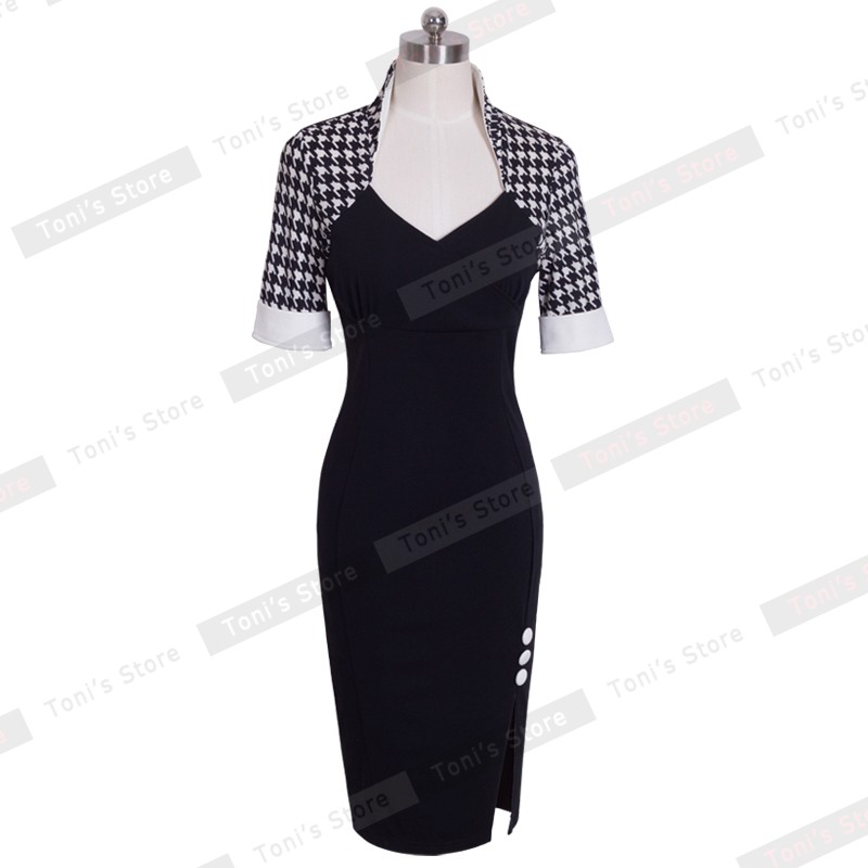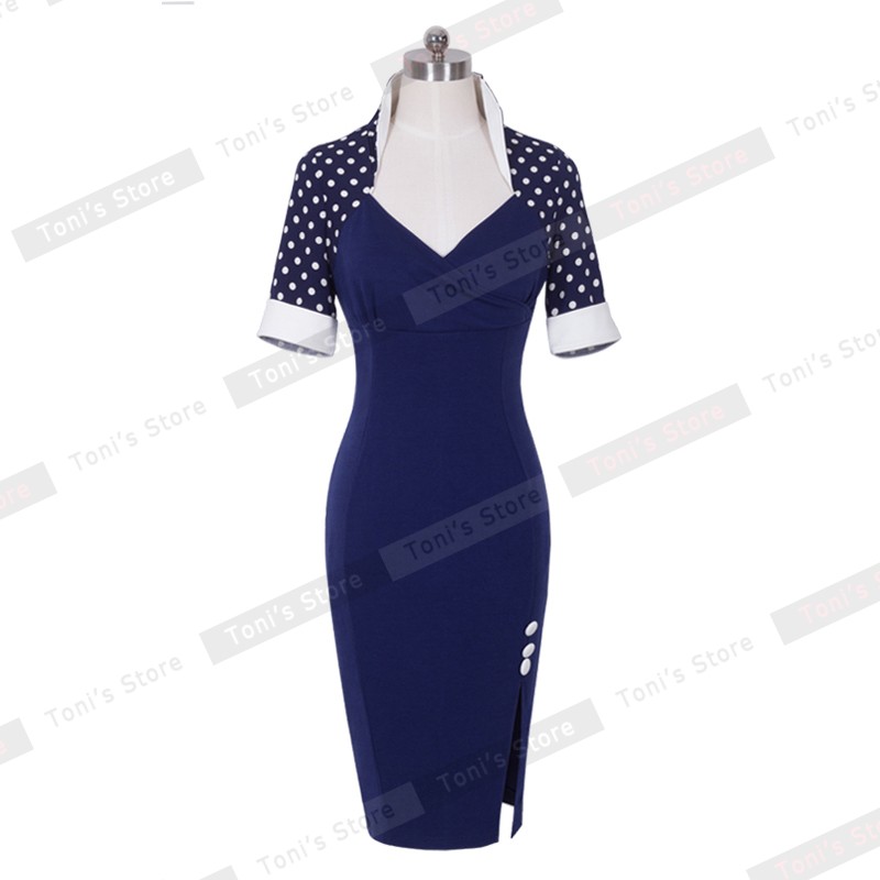 > Damen Bekleidung > Kleider > schön ewig Polka Dots Eleganten Damen Patchwork Tasten Platz Hals Scheide Kleid tragen zur arbeit an split bleistif