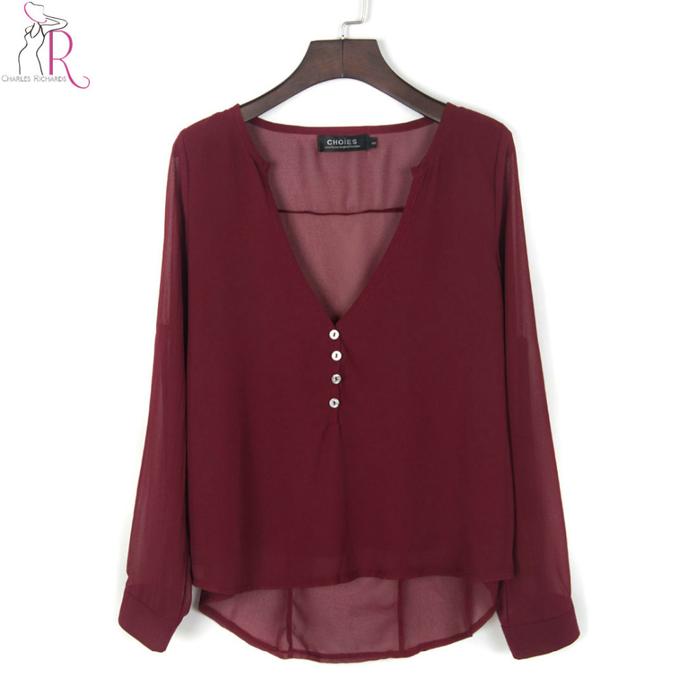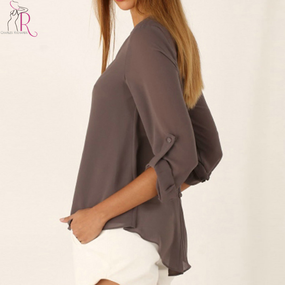 > Damen Bekleidung > Shirts > Graue lange Ärmel Chiffon Bluse Hemd fällt tief Hals zugeknöpft wieder Hoch niedrig asymmetrischen Locker lässig