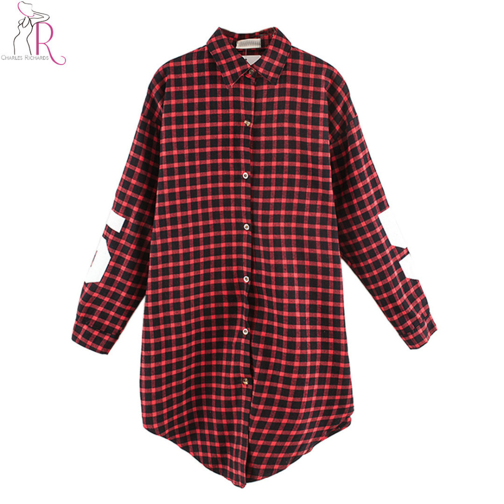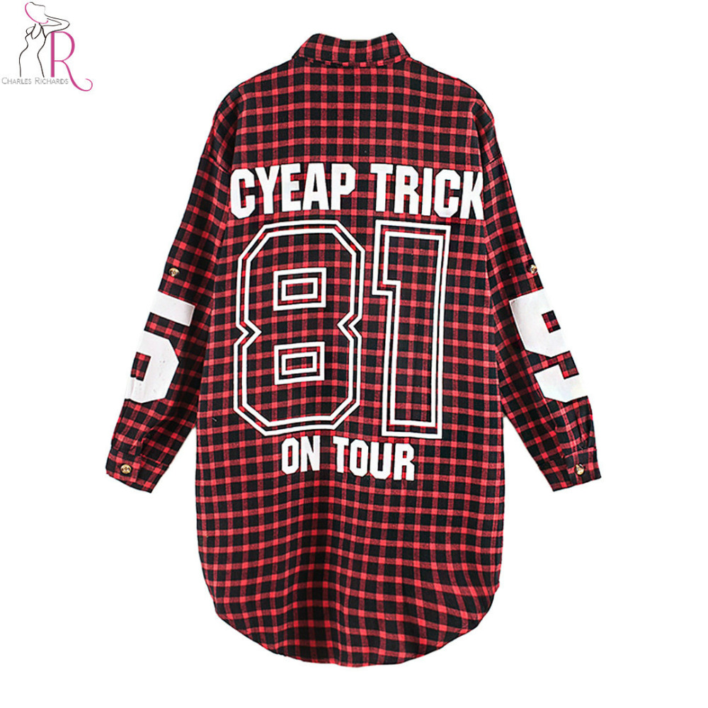> Damen Bekleidung > Shirts > Rote Damen Freund bf Stil Besticktes karierten lange Ärmel lang überdimensionalen Locker Hemd wieder Buchstaben