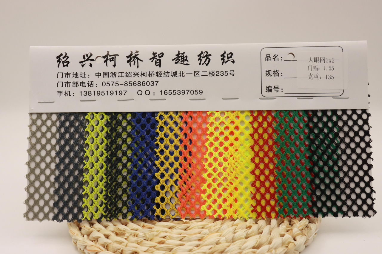 pattern solid color Main process dyeing use Pants, outdoor wear/sportswear, work clothes/uniforms color multi color mix Product name net Weight 135g/㎡ Element Polyester Weaving style knitting fabric weave warp knitting Door width 155 cm Article number 2*2 large mesh ![]()