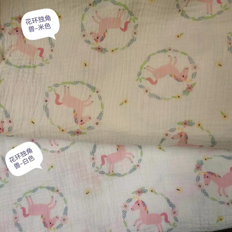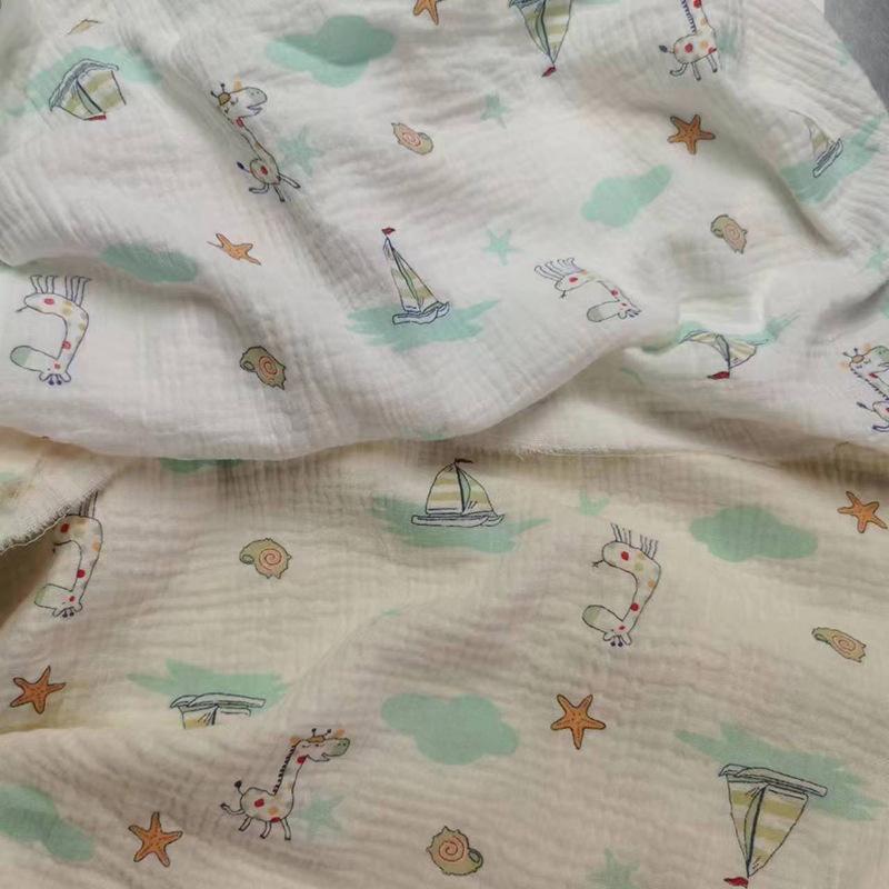 Double-layer yarn printed crepe maternal and infant grade pure cotton double-layer yarn fabric small floral home wear washed wrinkled yarn fabric is pattern: animal pattern, weight (g/㎡): 130 g/㎡, main process: printing, yarn count : 40*40, printing and dyeing process: reactive printing, composition and content: 100% cotton, specifications: 155cm wide printed double-layer yarn children's fabric, weaving method: woven