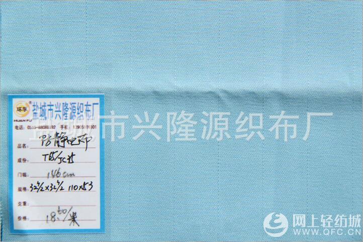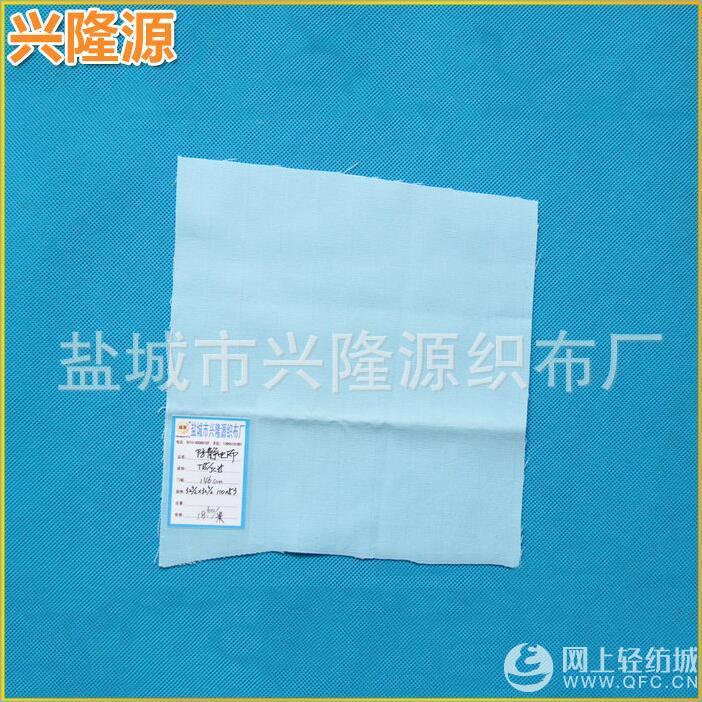 Factory direct sales of light blue anti-static fabric fireproof anti-static fabric at an affordable price is warp yarn count: 32s/2, weft yarn count: 32s/2, warp yarn composition: T65, weft yarn composition: JC35, warp yarn density: 110, weft yarn density: 53, door width: 57/58, edge: smooth edge