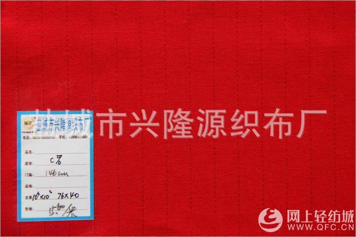 Supply wholesale red cotton anti-static cloth. Anti-static cloth with good quality is warp yarn count: 10s, weft yarn count: 10s, warp yarn composition: C, weft yarn composition: C, warp yarn density: 76, weft yarn density: 40, width: 57/ 58, Selvedge: raw edge